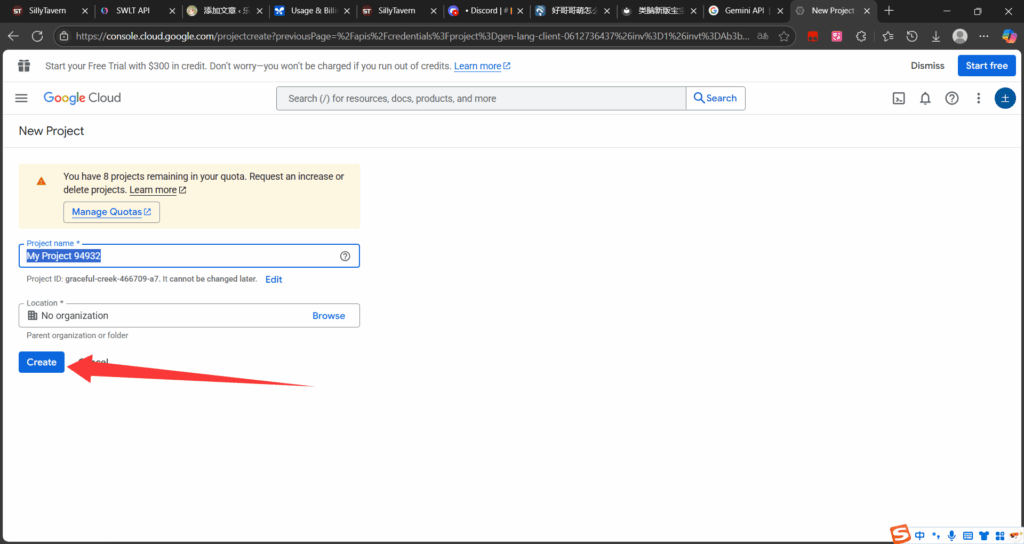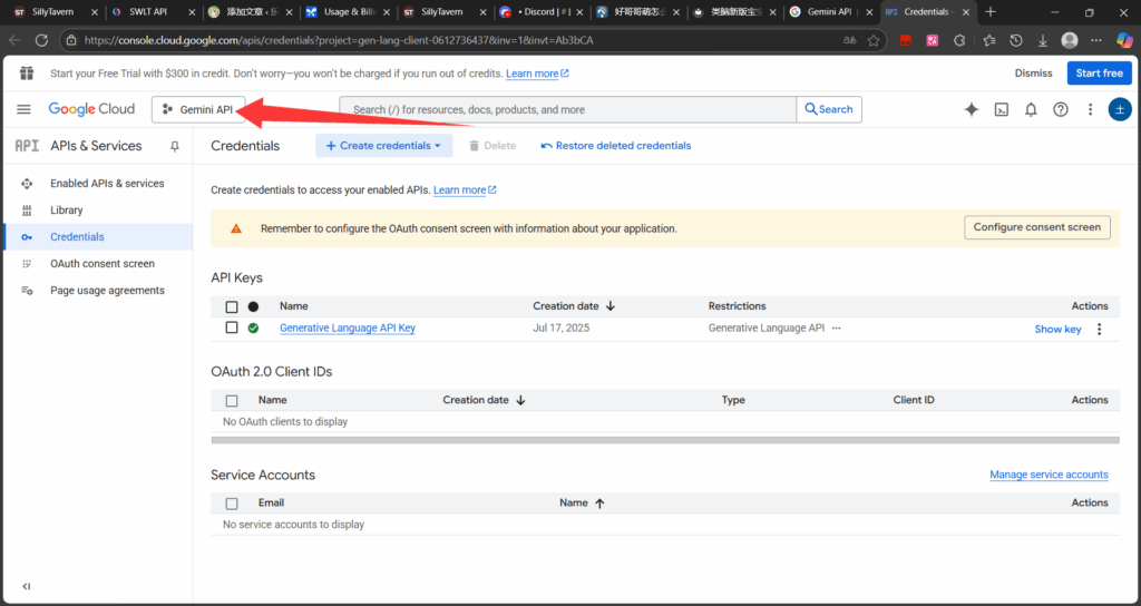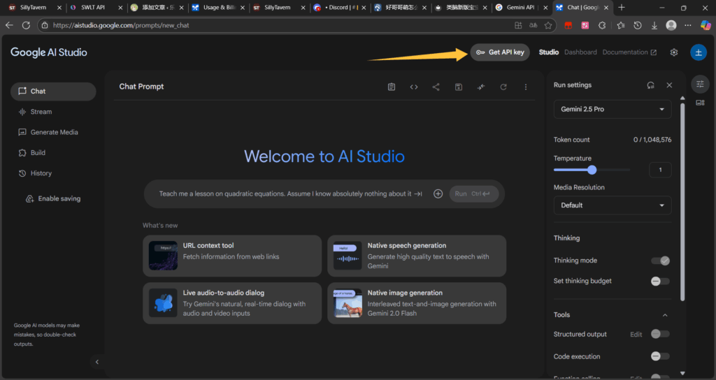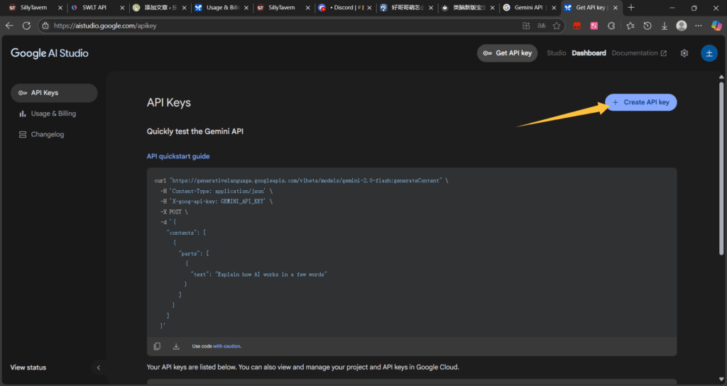 获取apikey,这里以谷歌的gemini为例(网络需要搭美国节点才能访问)
