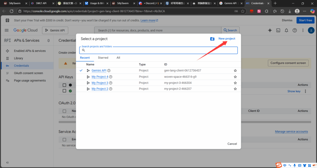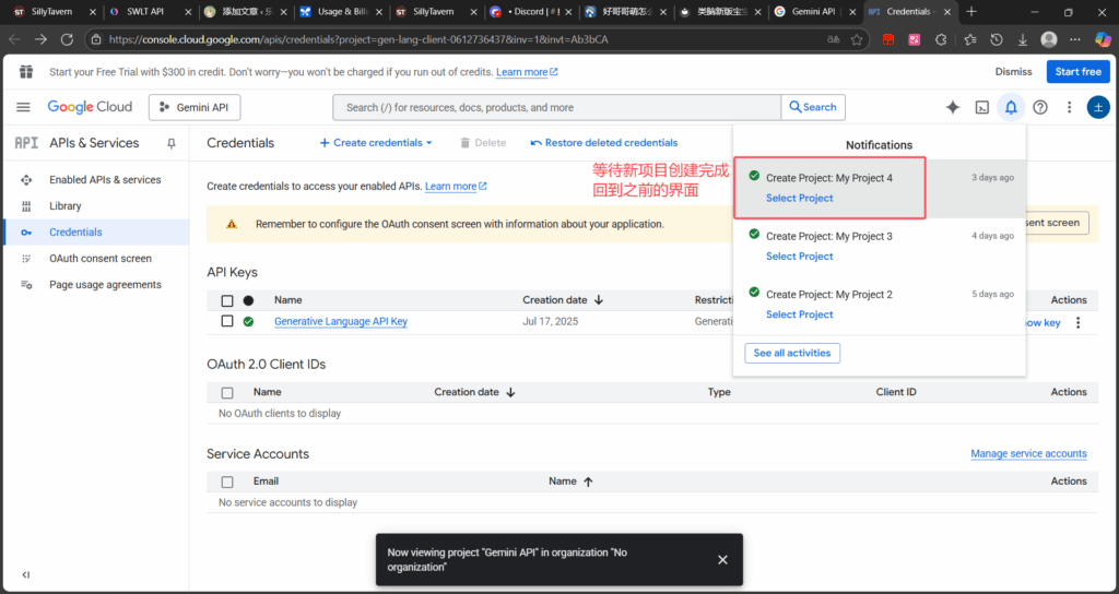 按照上图通过添加项目来获取api配额,然后把这些秘钥全部复制粘贴到某个地方记下来。