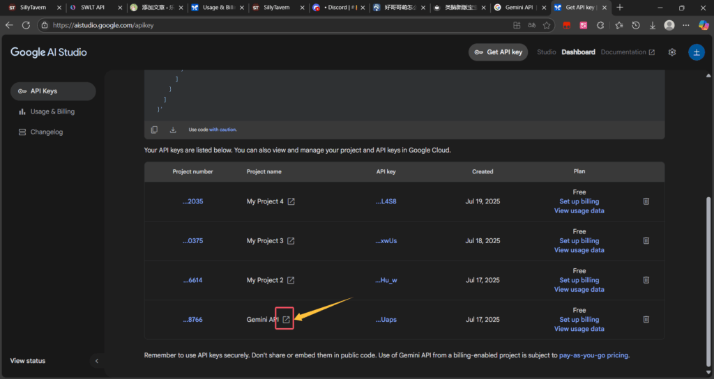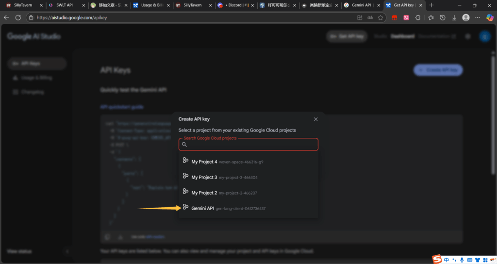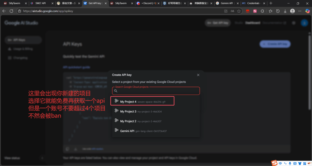 登录谷歌账号后这样一顿点点点你就获得了一个api,把秘钥粘贴到想用大模型的地方就能用了。具体看其他api秘钥使用教程,大同小异。